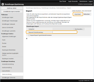 Geben Sie in [Passwort Entschlüsselung] das gleiche Passwort ein, das beim Exportieren der Einstellungsdaten eingegeben wurde.