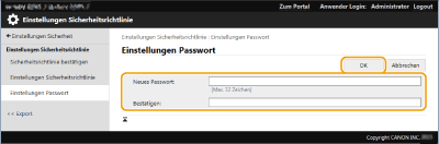 Geben Sie das aktuelle Passwort unter [Altes Passwort:] ein, und klicken Sie auf [OK] ohne einen Wert für [Neues Passwort:] oder [Bestätigen:] einzugeben (lassen Sie sie leer). Wenn ein Zeicheneingabegrenzwert unter [Einstellungen Passwort-Richtlinie] konfiguriert wurde, dann müssen Sie einen Wert bei dieser Einstellung eingeben. Löschen Sie den Grenzwert, bevor Sie das Passwort entfernen.