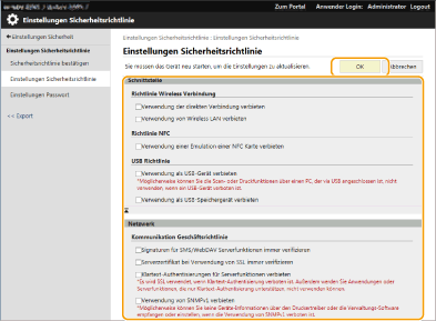Wenn Sie eine Sicherheitsrichtlinie konfiguriert haben, wird eine Meldung mit der Angabe angezeigt, dass Funktionen und Vorgänge eingeschränkt sind, wenn das Fenster <Einstell./Speicherung> im Bedienfeld oder Remote UI angezeigt wird.