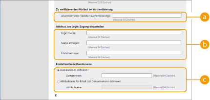4 | Geben Sie an, wie Attributnamen und Domainname festzulegen sind. ![]() [Anwendername (Tastatur-Authentisierung):]Legen Sie das LDAP-Datenfeld (Attributname) für den Benutzernamen auf dem LDAP-Server fest (Beispiel: uid). [Login-Name:] / [Name anzeigen] / [E-Mail-Adresse]Legen Sie die LDAP-Datenfelder (Attributnamen) für den Anmeldenamen, Anzeigenamen und die E-Mail-Adresse des jeweiligen Benutzerkontos auf dem LDAP-Server fest (Beispiel: uid, cn, mail). [Domännamen definieren] / [Attributname für Erhalt des Domännamens definieren]Wählen Sie, wie der Domänenname des Anmeldeziels festgelegt werden soll. Um den Domänennamen direkt festzulegen, wählen Sie [Domännamen definieren], und geben Sie den Domänennamen ein. Um ein LDAP-Datenfeld (Attributname) festzulegen, aus dem der Domänenname auf dem LDAP-Server bezogen wird, wählen Sie [Attributname für Erhalt des Domännamens definieren], und geben Sie dann den Attributnamen ein (Beispiel: dc). |
