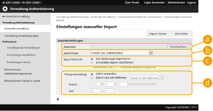 Importiert Benutzerdaten, die mithilfe der Erweiterter Platz Benutzerzugangskontrolle von einem Canon-System exportiert wurden. Die Dateierweiterung lautet ".csv".
