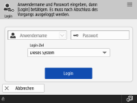 | | Benutzer melden sich mit dieser Methode an, indem Sie ihren Benutzernamen und das Passwort mithilfe der im Bedienfeld eingeblendeten Tastatur eingeben. Diese Methode ist unabhängig von dem verwendeten Authentifizierungsgerät verfügbar. |