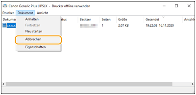 Wählen Sie das abzubrechende Dokument aus, und klicken Sie auf [Dokument]  [Abbrechen].