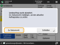 So überprüfen Sie die Gesamtanzahl der angegebenen EmpfängerDie Gesamtanzahl der angegebenen Empfänger wird oben rechts am Bildschirm angezeigt. Dadurch können Sie vor dem Senden bestätigen, dass die Anzahl der Empfänger korrekt ist. Um einen Auftrag, der gerade gesendet wird, sofort abzubrechen, gehen Sie wie folgt vor.Wenn Sie während des Sendens eines Auftrags auf dem Bedienfeld  (Stopp) drücken, erscheint die Meldung <Soll der folgende Sendeauftrag abgebrochen werden?>. Drücken Sie <Ja>, um den Sendevorgang abzubrechen. Drücken Sie  (Stopp), wenn mehrere Sendeaufträge vorhanden sind, um den Bildschirm für die Auswahl des abzubrechenden Sendeauftrags anzuzeigen. Wenn der Sendeauftrag, den Sie abbrechen möchten, nicht angezeigt wird, drücken Sie <Andere Aufträge prüf.>, um die <Sendeaufträge> anzuzeigen. Wählen Sie den Auftrag aus, den Sie abbrechen möchten und drücken Sie <Abbrechen>. So prüfen Sie den Status gesendeter/gespeicherter DokumenteWenn <Benachricht.anzeigen, wenn ein Auftrag akzeptiert ist> auf <Ein> gestellt wird, kann der <Statusmonitor>-Bildschirm über folgenden Bildschirm angezeigt werden, der nach Empfang eines Sendeauftrags eingeblendet wird. <Benachricht.anzeigen, wenn ein Auftrag akzeptiert ist>So drucken Sie den Bericht für die Sende-/SpeicherergebnisseWenn Sie auf der Anzeige für Grundeigenschaften des Scannens auf <Optionen>  <SE Ergebnisbericht> drücken, können Sie festlegen, dass der Bericht mit den Sende-/Speicherergebnissen automatisch gedruckt wird. Um dies für jeden Auftrag von <Optionen> einzustellen, müssen Sie <Nur bei Fehler> oder <Aus> in <SE Ergebnisbericht> wählen und dann <Drucken über Optionen zulassen> auf <Ein> einstellen. DateinameBeim Senden/Speichern einer Datei wird automatisch der Dateiname für die Datei im folgenden Format festgelegt. Sie können die Einstellung ändern, sodass ein anderer Name zugewiesen werden kann. Festlegen eines DateinamensBeim Senden per E-Mail Format "Auftragsnummern (vier Stellen)_Seitenzahlen (drei Stellen).Dateierweiterung", wie "1042_001.jpg" Beim Speichern in einem Dateiserver Format "Jahr, Monat, Tag, Stunde, Minute und Sekunde des Speicherzeitpunkts (14 Stellen).Dateierweiterung", wie "20151030133541.jpg" E-Mail-BetreffDer in <Standardthema> eingegebene Betreff wird automatisch festgelegt ( <Standardthema>). Wenn Sie einen anderen Betreff angeben, ändern Sie die Einstellung, oder legen Sie jedes Mal beim Senden einer E-Mail den Betreff fest ( Festlegen der E-Mail-Einstellungen). |