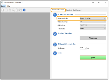 Beim Scannen ist es möglich, Farbe, Auflösung und Originalformat einzustellen. Darüber hinaus können Sie nach dem Klicken auf die Registerkarte [Erweiterte Einstellungen] detaillierte Einstellungen vornehmen, wie beispielsweise Originalausrichtung. Weitere Informationen finden Sie in der Hilfe für Color Network ScanGear 2.