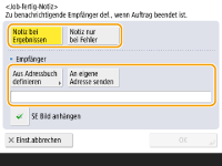 Wenn Sie <Notiz bei Ergebnissen> auswählen, wird für jeden Sendeauftrag eine Benachrichtigungs-E-Mail gesendet. Wenn Sie <Notiz nur bei Fehler> auswählen, wird nur beim Auftreten eines Fehlers eine Benachrichtigungs-E-Mail gesendet.