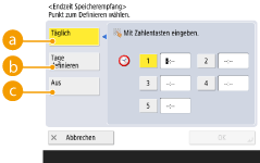 4 | Drücken Sie <Startzeit Speicherempfang>, und legen Sie die erforderlichen Einstellungen fest. ![]() <Täglich>Stellen Sie die Zeit für den Start des Speicherempfangs ein. <Tage definieren>Stellen Sie den Wochentag und die Zeit für den Start des Speicherempfangs ein. <Aus>Wählen Sie dies, wenn Sie keine Startzeit für den Speicherempfang einstellen möchten.