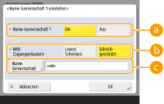 Bei der dedizierten Community handelt es sich um eine voreingestellte Community für die Canon-Geräteverwaltungssoftware. Um die dedizierte Community zu verwenden, drücken Sie <Zugewiesene Gemeinschaft einstell.>. Um eine allgemeine Community festzulegen, drücken Sie <Name Abt. 1 einstellen> oder <Name Abt. 2 einstellen>.