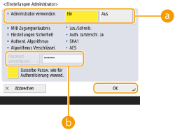 Wenn "Administrator" deaktiviert ist, können Sie <Einstellungen Administrator> nicht festlegen (die Einstellung von <Administrator verwenden> ist fest auf <Aus> gesetzt).