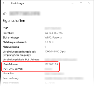 2 | Unter [Eigenschaften] sehen Sie die IP-Adresse und den DNS-Server. |