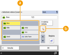 Per l'amministratoreÈ possibile esportare/importare la Rubrica e i pulsanti di selezione veloce. Ciò serve come dati di backup in caso di malfunzionamento o per semplificare la procedura per la registrazione di destinazioni tra macchine supportate. Per maggiori informazioni, vedere Importazione/esportazione delle singole impostazioni. La rubrica può essere personalizzata per ogni utente che ha effettuato l'accesso (Elenco di voci personalizzabili). Inoltre, la funzione Sincronizza impostazioni personalizzate può essere utilizzata per far sì che la rubrica venga condivisa tra più stampanti multifunzione Canon (Sincronizzazione delle impostazioni per più stampanti multifunzione Canon). È possibile impostare una password per evitare modifiche o cancellazioni non autorizzate nella Rubrica. Impostazione di un PIN per la Rubrica Se ci sono destinazioni che non si desidera visualizzare nella Rubrica, oppure se si desidera limitare l'accesso degli utenti alle destinazioni, immettere un numero di accesso alla registrazione di una destinazione. Per usare il numero di accesso, è necessario attivare anticipatamente l'impostazione in Limitazione dell'accesso alle destinazioni registrate nella Rubrica. Configurare gli elenchi di indirizzi di gruppi di utenti dall'IU remota. (Registrazione delle destinazioni mediante IU remota) |
