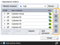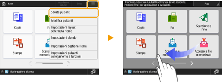 Utilizzare come se si trattasse di uno smartphone (scorrere/trascinare e rilasciare)In alcune schermate, è possibile cambiare pagina o scorrere sullo schermo con il dito verso l'alto/il basso o verso sinistra/destra come se si trattasse di uno smartphone. Le operazioni di scorrimento e trascinamento della selezione non possono essere utilizzate quando <Inversione colori schermo> è impostato su <On>. <Inversione colori schermo>Nelle schermate che consentono lo spostamento dei pulsanti, i pulsanti possono essere spostati mediante trascinamento. Scorrimento di un elencoSu alcuni schermi, scorrere verso l'esterno di un elenco continua a far scorrere l'elenco. |