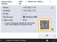 Quando viene visualizzato un codice QR su una finestra Dettagli di un registro di errore, la scansione del codice QR con un dispositivo mobile, come uno smartphone o un tablet, consente di accedere a una pagina della Guida per l'utente per questa macchina, che indica come gestire l'errore.