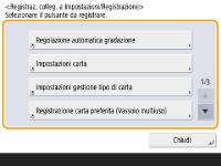 Se <Collegamento a Impostaz./Reg.> non è visualizzato nella schermata <Home>, premere  <Impostazioni gestione Home>  <Limite visualizzazione funzioni>  <Imposta>  impostare <Collegamento a Impostaz./Reg.> da visualizzare. Scelte rapide che è possibile registrare: 10 |
