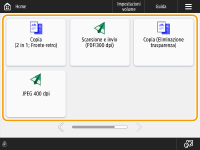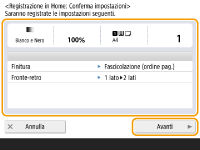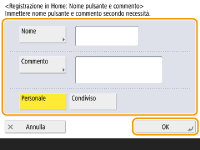 Per registrare un pulsante personale, è necessario accedere con la gestione dell'autenticazione personale. Configurazione delle impostazioni di gestione dell'autenticazione personale Se si seleziona <Informazioni autenticaz. accesso periferica> per <Inform. usate per autenticaz. TX file/sfoglia>, non viene memorizzata alcuna password per la destinazione del file in un pulsante personale. <Inform. usate per autenticaz. TX file/sfoglia> Per informazioni sul numero massimo di pulsanti personali e pulsanti condivisi che è possibile registrare, vedere Funzioni di gestione. Non è possibile cambiare i pulsanti personali in pulsanti condivisi e viceversa. Per farlo, richiamare le impostazioni e registrare un altro pulsante da .Tenere premuto un pulsante per modificarne il nome/commento o spostarlo/eliminarlo. Le stesse operazioni (modifica del nome/commento o spostamento/eliminazione di un pulsante) possono essere eseguite da nella schermata <Home>. Personalizzazione della schermata <Home>I pulsanti personali possono essere condivisi tra più periferiche sincronizzando i dati personalizzati. Elenco di voci personalizzabili Impostazioni registrabili nei pulsanti personali/pulsanti condivisiDi seguito sono indicate le funzioni e le impostazioni che possono essere registrate nei pulsanti personali/pulsanti condivisi. Impostazioni che possono essere registrate in <Impostazioni preferite> per la funzione <Copia> Riduzione delle operazioni di copia <Fax> impostazioni della funzione fax della macchina Operazioni di base per l'invio di fax Impostazioni che possono essere registrate in <Impostazioni preferite> per la funzione <Scansione e invio> Funzioni di scansione utili Impostazioni che possono essere registrate in <Impostazioni preferite> per la funzione <Scansione e memorizzazione> Impostazione della schermata e delle attività per la scansione e il successivo salvataggio Salvare le posizioni per le funzioni <Scansione e memorizzazione> e <Accesso a file memorizzati> Utilizzo dello spazio di memorizzazione Scelte rapide per la schermata delle funzioni di base per la funzione <Mailbox fax/I-Fax> È possibile registrare l'accesso a un server e la password di accesso nei pulsanti personali/pulsanti condivisi, in modo da evitare l'inserimento della password quando si richiama il pulsante registrato. Se si desidera definire la password nelle impostazioni memorizzate nel pulsante registrato, poiché si importano spesso le impostazioni in un pulsante personale o condiviso in un'altra macchina e si desidera evitare che gli utenti assumano l'identità di altri, escludere la password quando si registra. Importazione/esportazione dei pulsanti registratiÈ possibile importare ed esportare i pulsanti registrati Personali/Condivisi dall'IU remota. Importazione/esportazione di tutte le impostazioni L’importazione batch di pulsanti Personali/Condivisi potrebbe non essere disponibile a seconda del modello di macchina da cui importare. Per ulteriori informazioni, contattare il rivenditore o il rappresentante di servizio. |