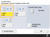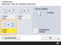 ![]() | È possibile copiare originali solo fronte su entrambi i lati del foglio. È inoltre possibile copiare un originale fronte-retro su entrambi i lati del foglio o su due pagine separate. Copia da solo fronte a fronte-retro Copia da fronte-retro a fronte-retro Copia da fronte-retro a solo fronte |
