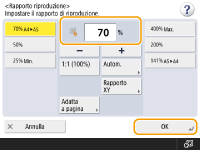 ![]() | È possibile ingrandire o ridurre specificando il rapporto di riproduzione (%). È possibile specificare o rapporti verticali e orizzontali singolarmente. Ingrandimento o riduzione delle copie specificando il rapporto di riproduzione | |