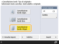 1 | Premere <Cancellazione bordi origin.> e impostare <Formato originale>. ![]() Se il formato visualizzato in <Formato originale> è diverso da quello dell'originale impostato, premere <Cambia> per selezionare il formato. |