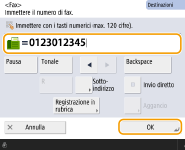 Invio di fax all'esteroImmettere il numero di accesso internazionale, il prefisso del paese e il numero di fax, in quest'ordine. Se non è possibile connettersi alla destinazione all'estero, premere <Pausa> per inserire una pausa tra un numero e il numero successivo. Invio di fax con un sottoindirizzoLa macchina supporta l'uso di sottoindirizzi standard ITU-T*. Se la macchina fax del destinatario è compatibile con l'impiego di sottoindirizzi ITU-T, è possibile aumentare la riservatezza dei documenti inviati usando un sottoindirizzo e una password. Per inviare un documento con un sottoindirizzo, immettere un numero di fax, premere <Sottoindirizzo>, quindi immettere il sottoindirizzo e la password. * Significa International Telecommunication Union-Telecommunication Standardization Sector, ovvero il gruppo che elabora raccomandazioni per la standardizzazione delle comunicazioni a livello mondiale. |