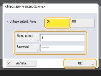 <Impostazione autenticazione>Per utilizzare la funzione di autenticazione del server proxy, premere questa opzione e configurare le informazioni di autenticazione. Sulla schermata che appare, premere <On>, inserire il nome utente e la password da utilizzare per l'autenticazione proxy e premere <OK>.