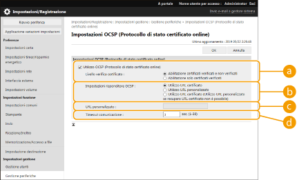 Esistono due metodi per verificare se i certificati ricevuti dall'altra parte nella comunicazione sono validi: confronto con l'elenco di revoche di certificati (CRL) registrato nella macchina e interrogazione di un risponditore OCSP (protocollo di stato certificato online), ovvero un server che supporta OCSP. Selezionarne il metodo per controllare la scadenza dei certificati in base all'ambiente di utilizzo. Questa registrazione può essere eseguita solo dall'amministratore.