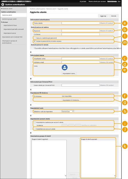 dc | No | Da 0 a 32 caratteri | Caratteri di controllo | - (N/D) | Impossibile modificare. Viene assegnato automaticamente per i seguenti utenti. Utenti registrati tramite autenticazione server |