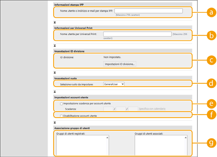 [Associazione gruppo di utenti]Quando si desidera assegnare l'utente ad un gruppo, selezionare un gruppo di utenti registrato dall'elenco e fare clic su [Aggiungi]. Questa impostazione non viene visualizzata quando si utilizzano gli ID divisione come gruppi di utenti.