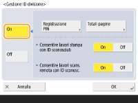 2 | Premere <Registra>. ![]() Per modificare le impostazioni dell'ID divisione Selezionare l'ID divisione che si desidera modificare e premere <Modifica> per visualizzare la schermata Modifica. Per eliminare le impostazioni dell'ID divisione Selezionare l'ID divisione che si desidera eliminare e premere <Elimina> <Sì>. |