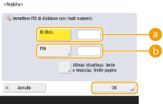 3 | Inserire l'ID divisione e il PIN e premere <OK>. ![]() <ID divis.>Inserire un numero di 7 cifre o più corto per l'ID divisione. <PIN>Inserire un numero di 7 cifre o più corto per il PIN e premere <Conferma>. Come conferma, inserire nuovamente il PIN e premere <OK>- Se non si desidera impostare un PIN, lasciare vuota questa voce. ![]() Non è possibile registrare un ID o PIN divisione composto solo da 0, come "00" o "0000000". Anche se si inseriscono meno di sette cifre, all'inizio del numero vengono aggiunti degli zeri in modo da impostare comunque un numero di sette cifre. È possibile premere <Attivaz./disattivaz. limite e impostaz. limite pagine> per impostare il numero totale di pagine che la divisione può utilizzare per la copia, la scansione e la stampa. È anche possibile fare in modo che l’immissione di sette cifre sia un requisito per gli ID divisione e i PIN. Per maggiori informazioni, contattare il rivenditore o il rappresentante di servizio. La macchina interrompe la stampa se uno dei limiti per le pagine a colori o in bianco e nero viene raggiunto durante la stampa di un documento contenente sia colori che aree in bianco e nero. La macchina interrompe la copia se uno dei limiti totali per la stampa o la copia di pagine a colori o in bianco e nero viene raggiunto durante la copia di un documento contenente sia aree a colori sia aree in bianco e nero. |
