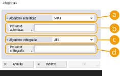 7 | Inserire le informazioni necessarie. ![]() <Algoritmo autenticaz.>Selezionare MD5, SHA1 o SHA2 a seconda dell'ambiente. Per SHA2, selezionare da quattro lunghezze di hash (224 bit, 256 bit, 384 bit, o 512 bit). <Password autenticaz.>Inserire una password da usare per l'autenticazione. Dopo aver inserito la password, appare <Conferma> per conferma. Inserire nuovamente la password. <Algoritmo crittografia>Selezionare <DES> o <AES> in base al proprio ambiente. <Password crittografia>Inserire una password da usare per la codifica. Dopo aver inserito la password, appare <Conferma> per conferma. Inserire nuovamente la password. |