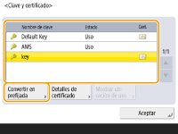 Seleccione la clave y el certificado para utilizar con comunicación cifrada TLS, y pulse <Convertir en prefijada>  <Sí>.