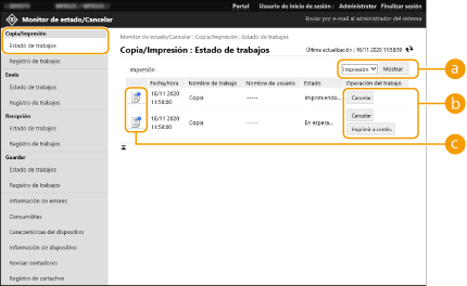 Inicie la IU remota  [Monitor de estado/Cancelar]  [Estado de trabajos] en [Copia/Impresión]