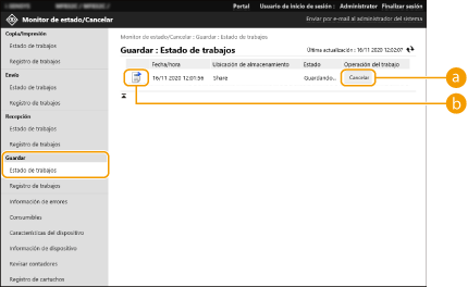 Inicie la IU remota  [Monitor de estado/Cancelar]  [Estado de trabajos] en [Guardar]