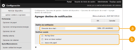 Haga clic en [Gestión del dispositivo] [Opciones de notificación de e-mail]  [Agregar destino de notificación].