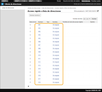 Haga clic en la lista de direcciones en la que desee registrar el destino ([Lista de direcciones personales], Listas de direcciones de grupos de usuarios, [Lista de direcciones 01] a [Lista de direcciones 10], o [Lista de direcciones para administradores]).