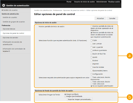 Puede configurar los métodos de inicio de sesión, los dispositivos de autenticación y otras funciones de autenticación a partir de su entorno de sistema y sus necesidades. También puede especificar cómo se muestra la pantalla de inicio de sesión.