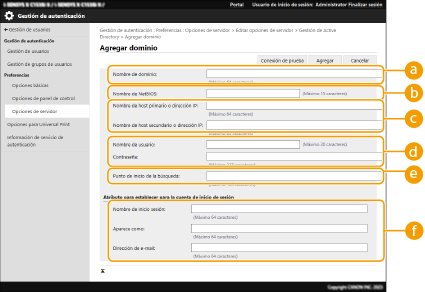 Para especificar un servidor Active Directory, Microsoft Entra ID o LDAP como dispositivo de autenticación adicional, deberá registrar la información del servidor empleado para autenticación. Si fuera preciso, lleve a cabo una prueba de conexión.