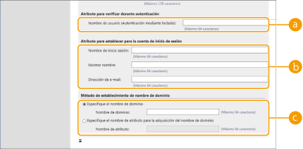 Marque la casilla de verificación para utilizar la cadena de caracteres registrada en el campo de datos en el servidor especificado en [Atributo de usuario a examinar:]. Antes de configurar, compruebe los nombres de rol que se pueden seleccionar en el equipo, y regístrelos en el servidor.