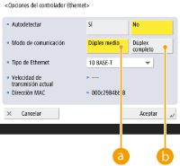 Ethernet es un estándar que estipula métodos de comunicación dentro de una red de área local. Normalmente, el sistema de comunicación (half-duplex/full-duplex) y el tipo de Ethernet (1000BASE-T/100BASE-TX/10BASE-T) se pueden configurar automáticamente. También los puede configurar por separado pasando a funcionamiento manual.