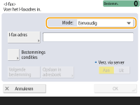 Als u de machine zo wilt instellen dat u het verzendresultaat van een document op het scherm <Statusmonitor> kunt controleren, selecteert u <Vol>. Indien niet, selecteert u <Eenvoudig>. Merk op dat de ontvanger de verzendmodus ook moet ondersteunen om het verzendresultaat te kunnen controleren. Afhankelijk van de machine bij de ontvanger kunt u geen I-fax verzenden tenzij u <Eenvoudig> selecteert.