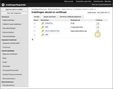 Certificaten die op deze machine worden gegenereerd, hebben geen CA-handtekening, waardoor communicatiefouten met sommige communicatie-evenknieën kunnen optreden. Om een certificaat met een CA-handtekening aan te vragen, zijn gegevens voor een certificaatondertekeningsverzoek (CSR) nodig. Een gebruiker die zich aanmeldt met beheerdersbevoegdheden, kan een CSR genereren.