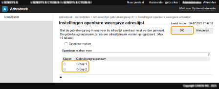 [Instellingen voor Persoonlijke adreslijst/Adressenlijst gebruikersgroep] en schakel het selectievakje [Gewijzigde naam voor gebruikersgroep op Adressenlijst gebruikersgroep toepassen] in. [Gewijzigde naam voor gebruikersgroep op Adressenlijst gebruikersgroep toepassen] is alleen beschikbaar wanneer persoonlijke-verificatiebeheer is ingeschakeld.