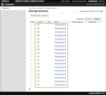 2 | Klik op [Niet geregistreerd] of een niet-geregistreerd snelkiesnummer. [Niet geregistreerd] wordt weergegeven bij [Naam] voor niet-geregistreerde snelkiestoetsen. Om snelkiestoetsen weer te geven die niet in de lijst worden getoond, selecteert u het bereik van de nummers bij [Lijstnummer] en klikt u vervolgens op [Weergave]. ![]() |