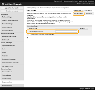 U kunt alle instellingengegevens importeren die zijn geëxporteerd naar een computer. Bij het importeren worden eerder geconfigureerde instellingen overschreven. Merk wel op dat sommige modellen machines misschien niet alle instellingen kunnen importeren.