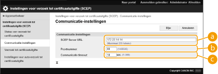 [Communicatie timeout:]Voer de time-outtijd voor communicatie met de SCEP-server in. De verbinding wordt geannuleerd als de SCEP-server niet binnen de ingestelde tijd reageert.