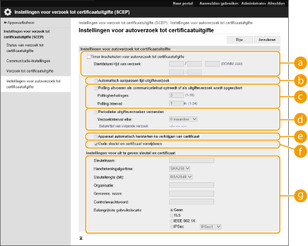 Een verzoek tot uitgifte van het certificaat dat nodig is voor sleutels die met de machine worden gegenereerd, kan worden verzonden naar een SCEP-server (Simple Certificate Enrollment Protocol) die certificaten beheert. Certificaten die vanaf de SCEP-server worden uitgegeven, worden automatisch op de machine geregistreerd. U kunt alleen een verzoek tot uitgifte van een certificaat verzenden als u Administrator-bevoegdheden hebt.