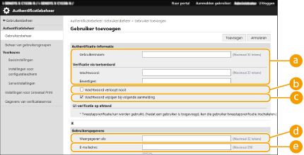 [Vervaldatum voor gebruikersaccount instellen]Bij het instellen van een geldigheidsduur van de account schakelt u het selectievakje in en voert u een waarde in voor [Vervaldatum].
