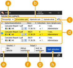 Op dit scherm kunt u documenten in de wachtstand, beveiligde afdrukdocumenten of gecodeerde beveiligde afdrukdocumenten afdrukken. U kunt de inhoud van deze documenten of geplande afdrukdocumenten controleren of de afdrukinstellingen wijzigen.