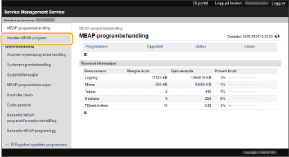 Etter at installasjonen er fullført, vises skjermbildet for administrasjon av MEAP-apper.