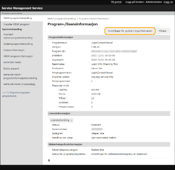 Serienummeret for maskinen vises. Bruk dette nummeret når du anskaffer en lisensfil. Skaffe lisensfilen